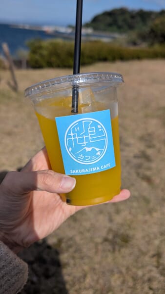 月読(ツキヨミ)神社。 1260年以上前からあるらしい。わお。 広さ的にコンパクトな神社なのでサクッと参拝。 本殿にご挨拶し、 そのあとは近くにあった売店で「桜島小みかんジュース」なるものを飲んでみました。