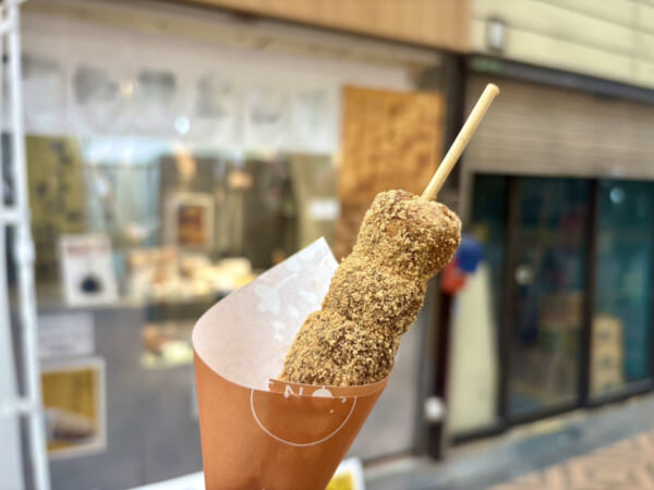 濃厚な味わいに定評があるという大分県産ブランド卵を用いた、同店人気No.1の親子丼。 なぜ私は、はるばる大阪に来て九州名物をいただいているのでしょうか。 理由は簡単。同行者が「どうしても食べたい」と言ったからです。 いずれも大変おいしゅうございましたわ♡ さて、グルメ紹介も終盤。そろそろスイーツの出番です。 まずは、食べ歩きグルメとしても有名なきなこだんご。 来阪前から「必ず買わねばなりませんわよ」と目をつけていた逸品です。