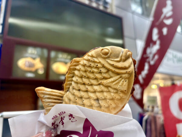 ちょっとこちら期待以上においしすぎてあと50本くらい購入すればよかったと 後悔しました……!! 何が素晴らしいって、きなこの存在感をこれでもかと堪能できる点です。「きなこがたっぷり掛かった」 という説明文を随所で見かけていたのですが、表面にまんべんなくまぶされているだけでなく、 お団子本体にもしっかり練り込まれているのではと思うほどでした。 お次は、大阪グルメの個人的大本命! 全国的に希少な天然たい焼きの名店…… ……への道中で見つけた、別のお店のあずきたい焼き。