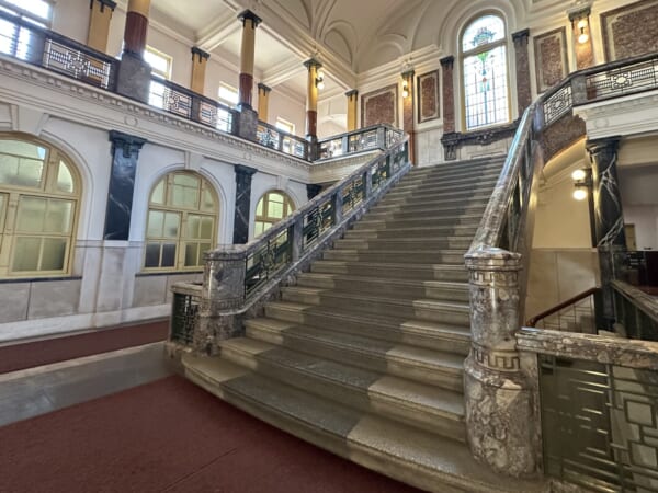 館内に足を踏み入れると、大きな階段とキレイなステンドグラスがお出迎え。