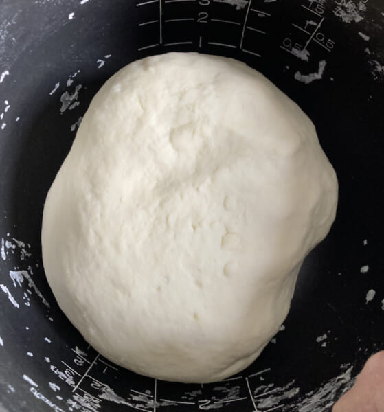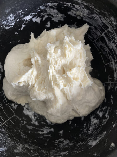 まず生地をこねるボウルがないので炊飯器の釜で代用。強力粉と薄力粉に水を加えて、