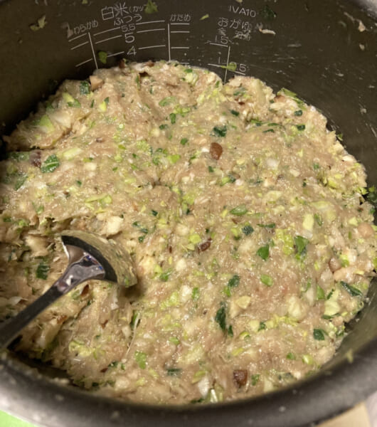 豚肉を粘りが出るまでこね、そこに鶏ガラスープを加えてまたこねることで、感動の肉汁を演出。